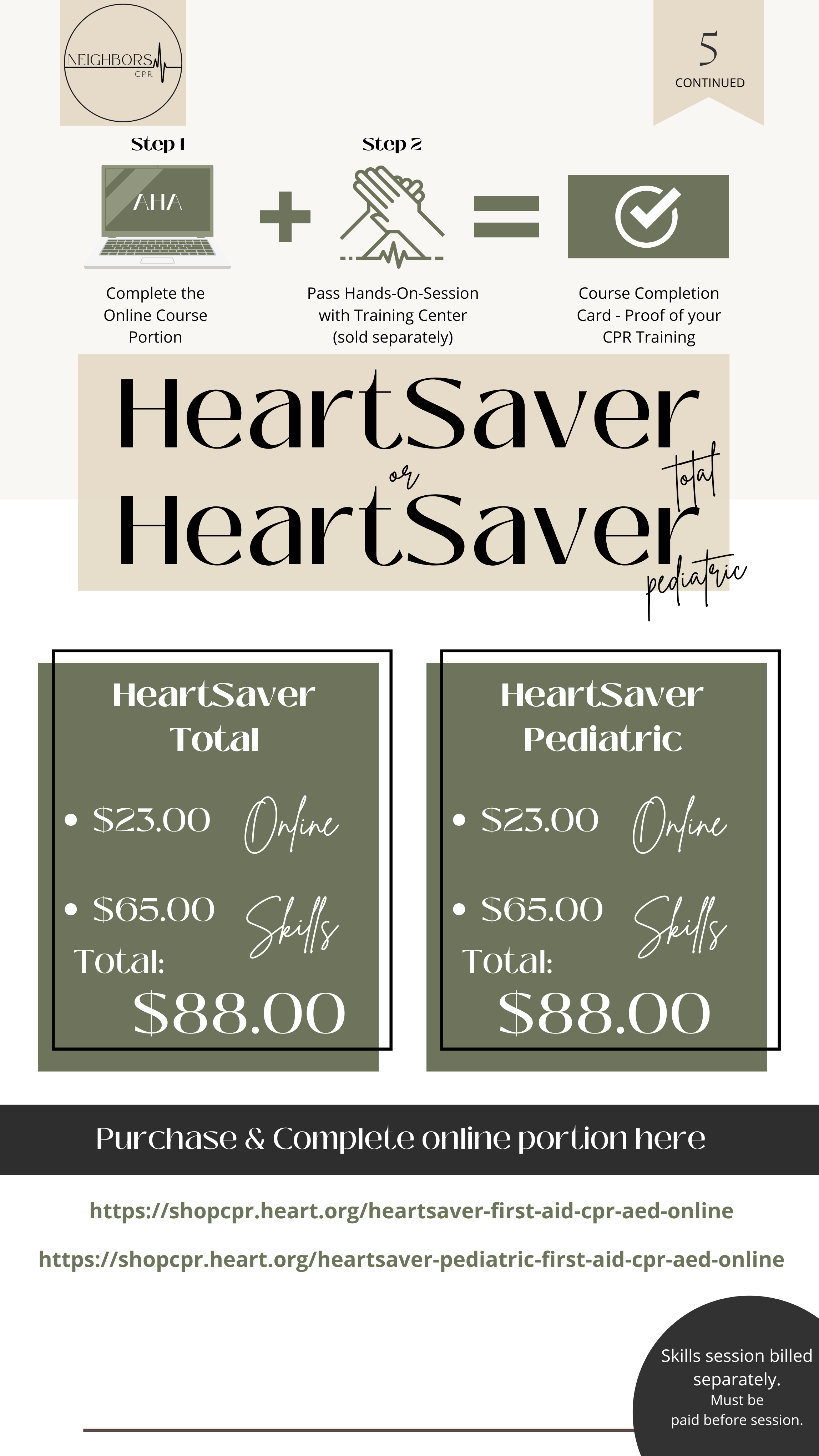 The AHA HeartSaver Total is for anyone who wants to be certified. First complete the online portion of HeartSaver First Aid, CPR, AED and then complete a hands-on skills session with an AHA instructor. Once successfully completed you will print a certificate that MUST be brought to your skills session.